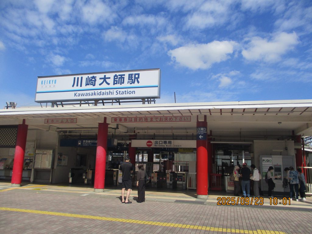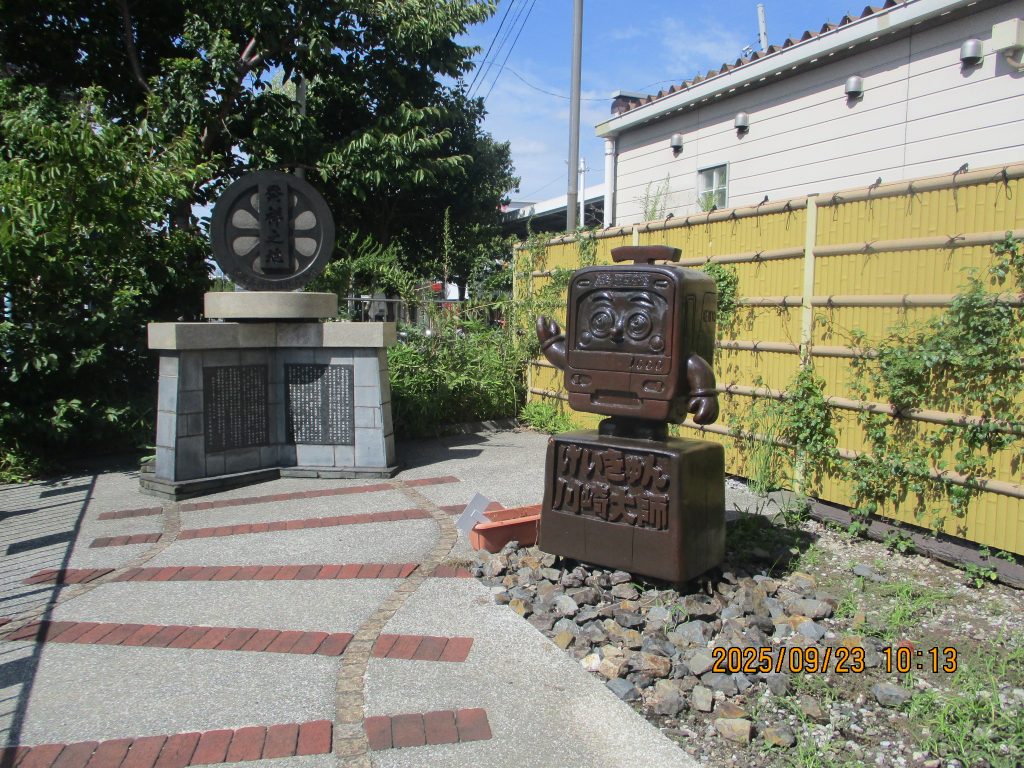 川崎大師駅南口10時に集合して、まず駅を出て右手に京浜急行発祥の記念碑を見ました。可愛らしい電車のモニュメントが目立っています。