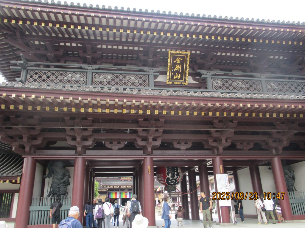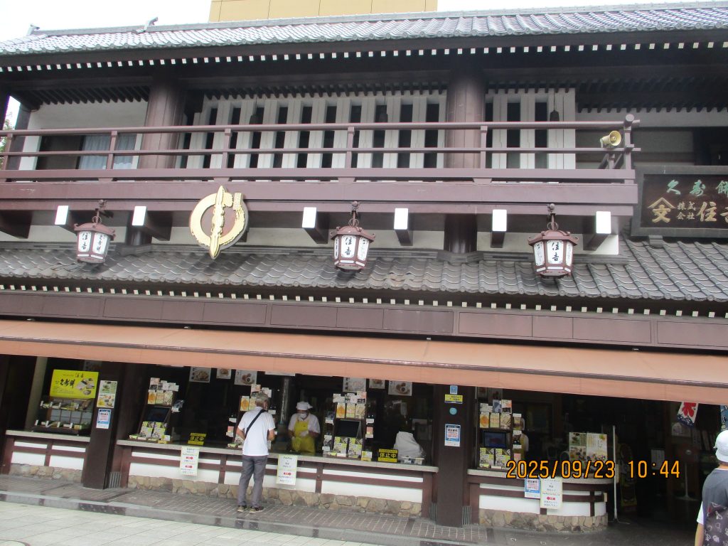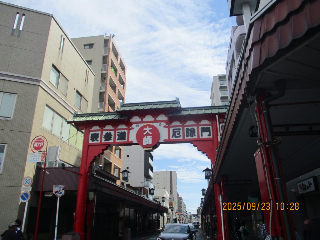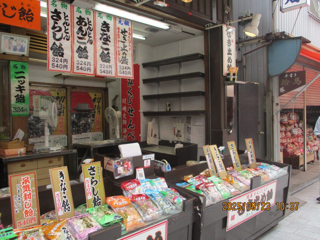 川崎大師表参道厄除け門という赤い門を潜りました。右に曲がると咳止め飴などの店がずらりと並んでいました。まずは久寿餅の住吉屋で買い物をしました、ずっしりと重い2~3人用900円を二箱、皆さまもそれぞれ買い求めていました。