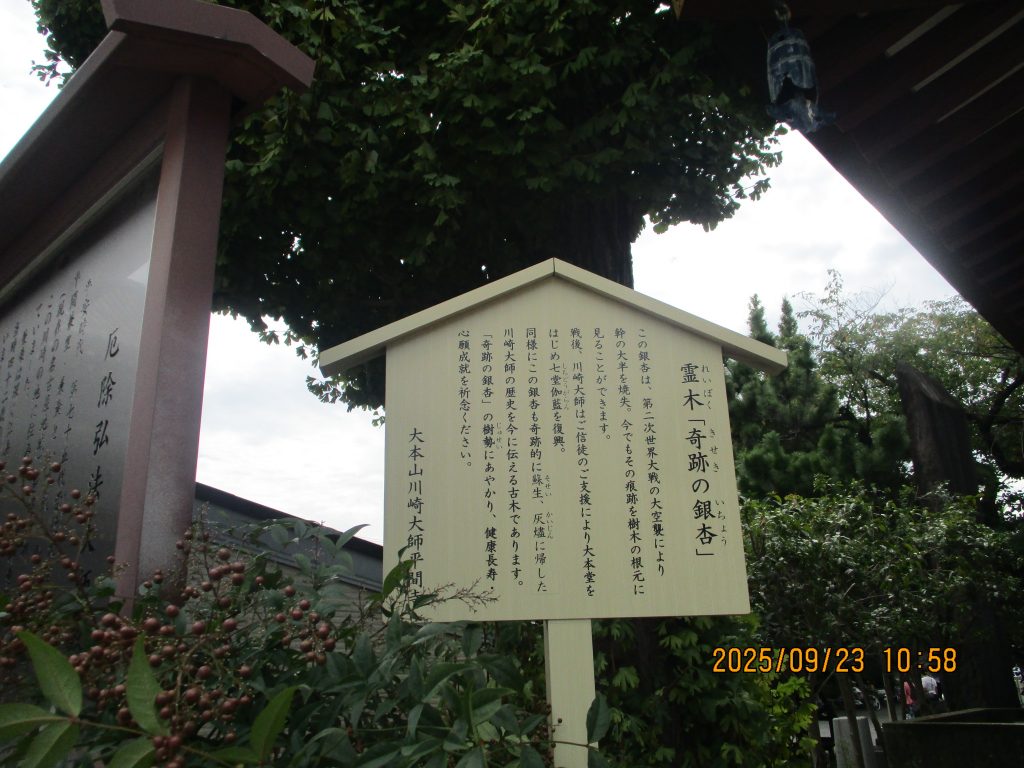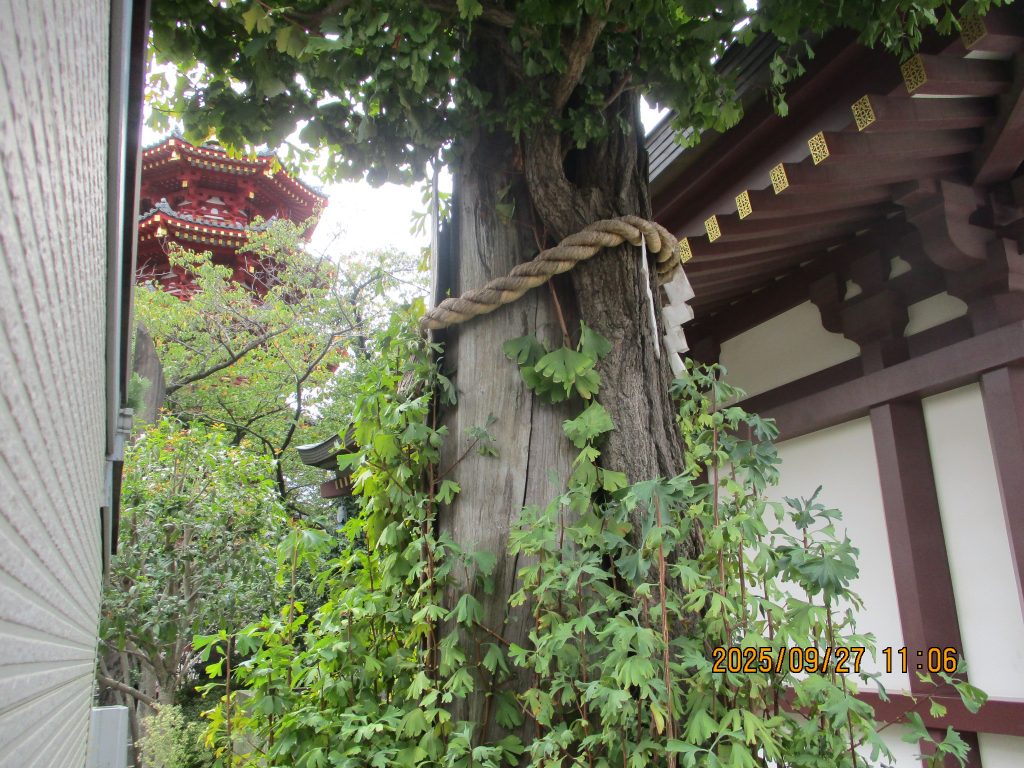 次の私たちが眺めたのは奇跡の銀杏でした。経蔵の傍の銀杏は先の戦争で幹の大部分が焼失しましたが復活しました。この奇跡の銀杏の樹勢にあやかり健康長寿、心願成就を祈念するのです。