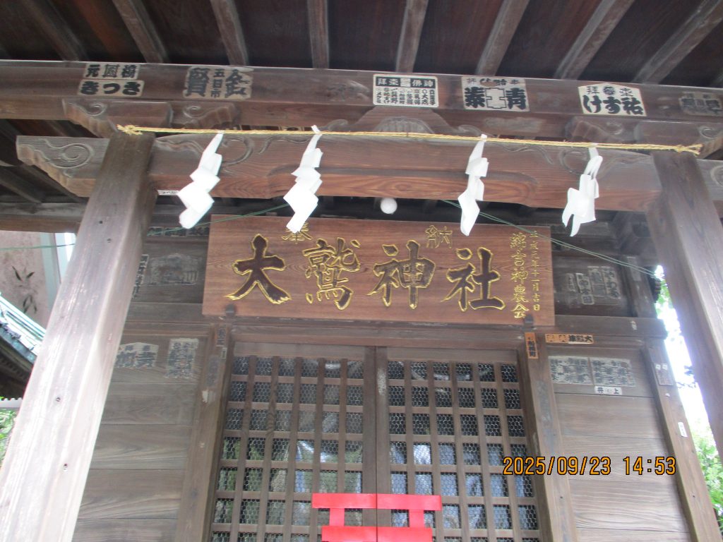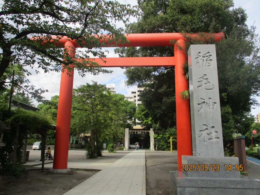 赤い大鳥居の台座には川崎宿の有力な旅籠の名が刻まれています。