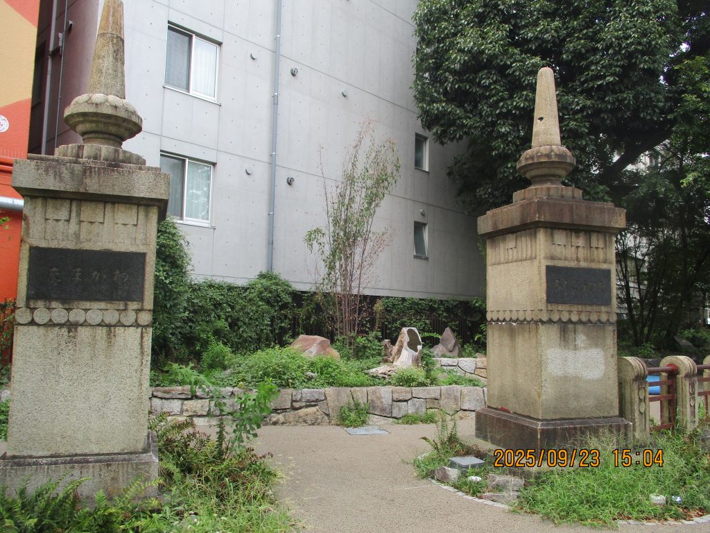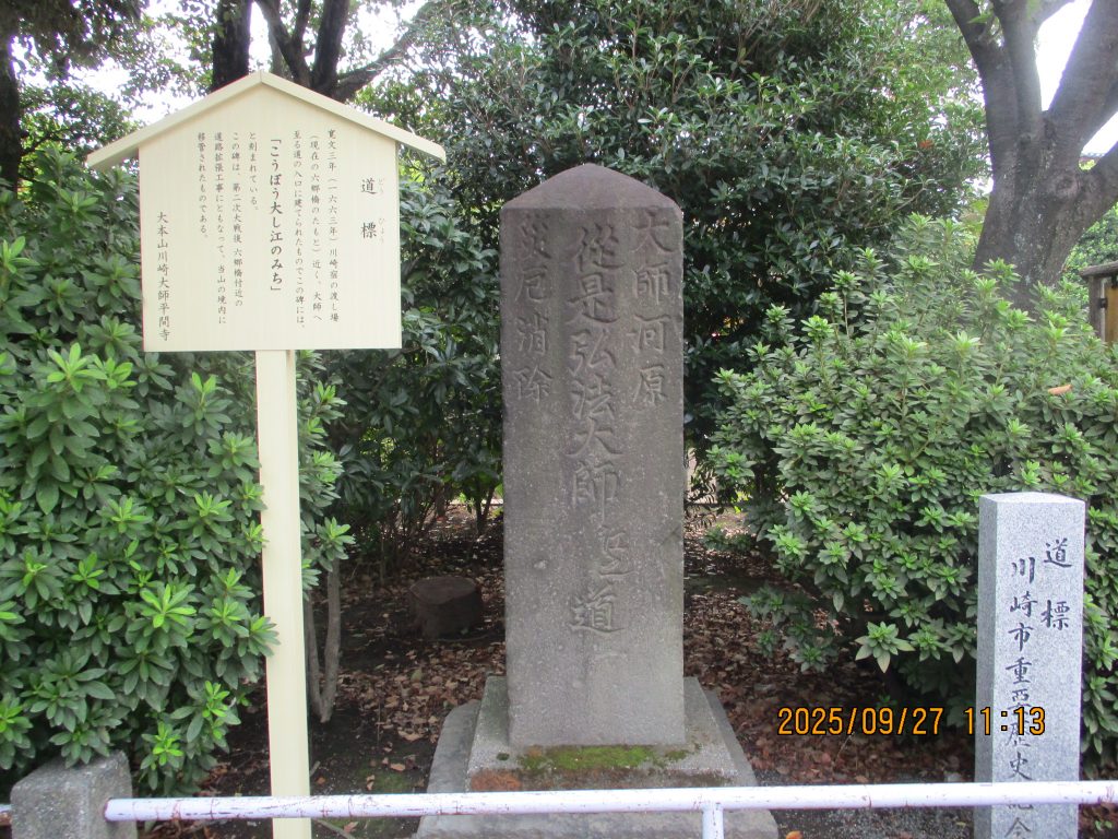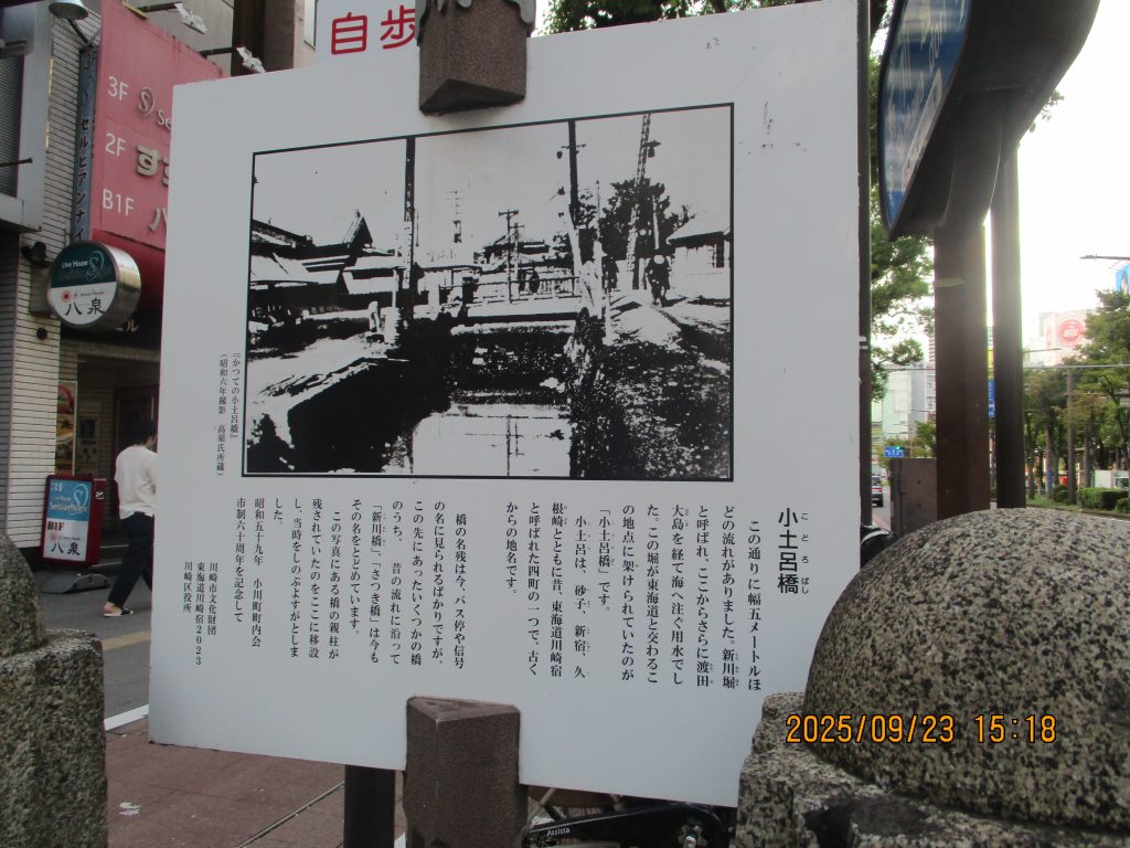 小土呂橋跡が舗道に残されています。川崎周辺の水田改良の為に慶安3年(1650)に関東郡代の伊奈忠治が普請奉行となり新川堀用水を掘削しました。現在は暗渠となっていますが大正時代の親柱が残っています。