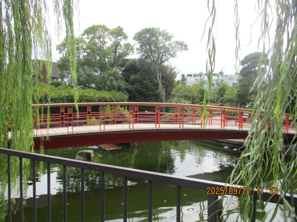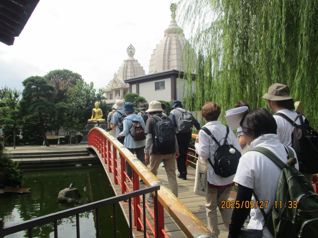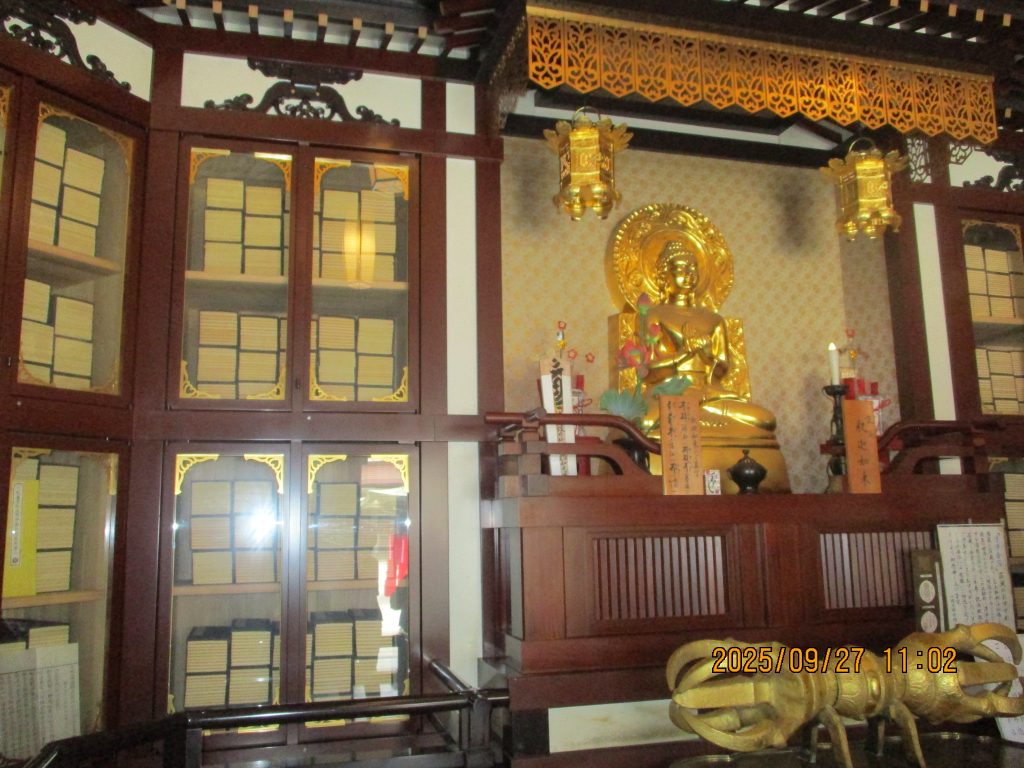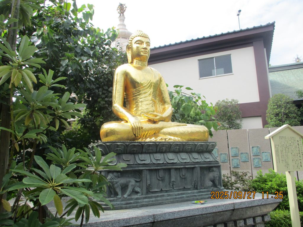 赤い「やすらぎ橋」を渡ると金色ピカピカの降魔成道釈迦如来像がありました。釈迦は菩提樹の下で禅定(瞑想)に入ると種々の悪魔が現れて誘惑、脅迫して妨害しましたが成道を開く(悟りを開く)この時左手を膝の上に置き右手を伸ばして大地を指しました。この時のお姿です。胎内にはインドから贈られた仏舎利が納めれれているとの事です。