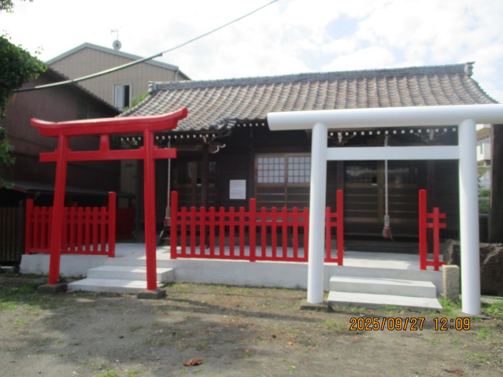 すぐ傍にこちらも江戸名所図会にある厳島・八海山神社に着きました。赤い鳥居が厳島神社で白い鳥居が八海山神社です。