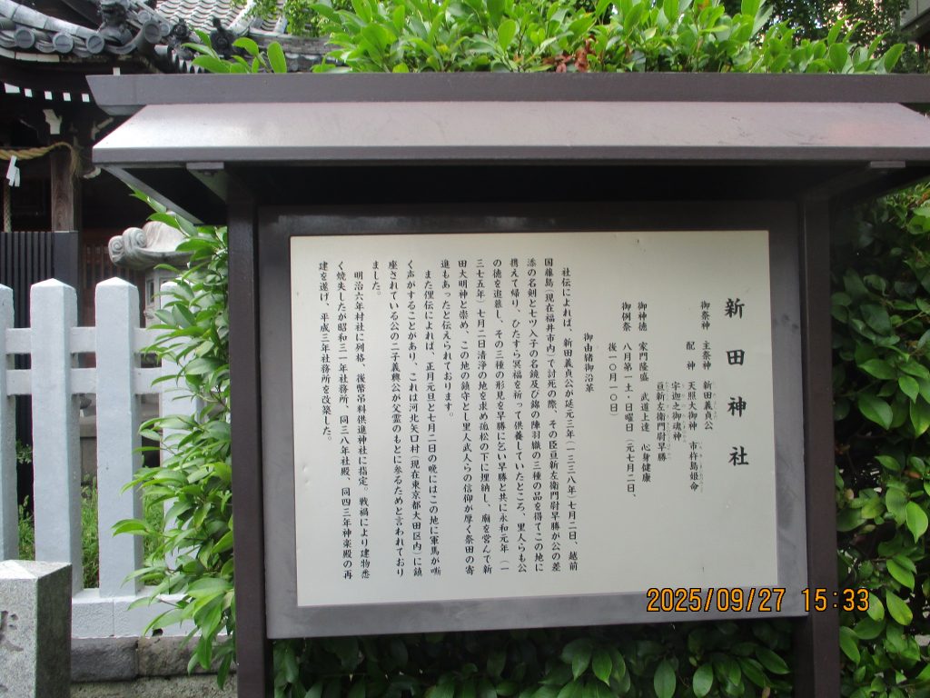 すぐ傍には新田神社がありました。新田義貞が越前国藤島で討ち死にした時に家臣の亘新左衛門早勝が遺品の剣や陣羽織を持ち帰り一本松の下に埋葬し新田大明神とし村内の鎮守として創建したと云われ昔の忠臣に感動を覚えました