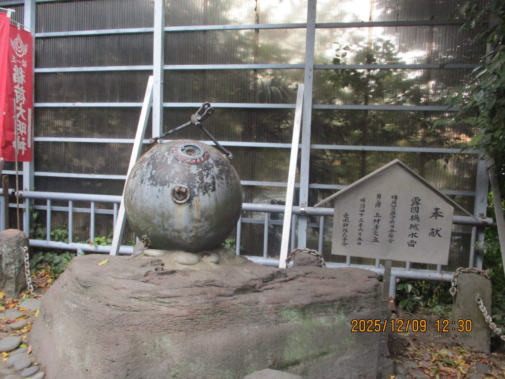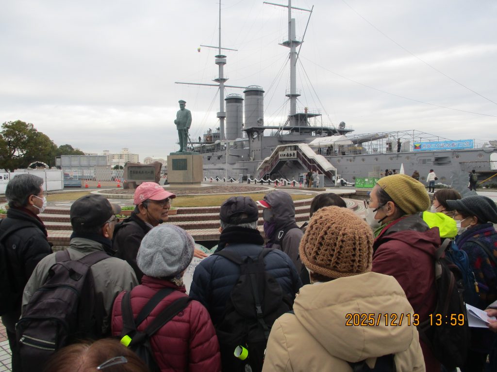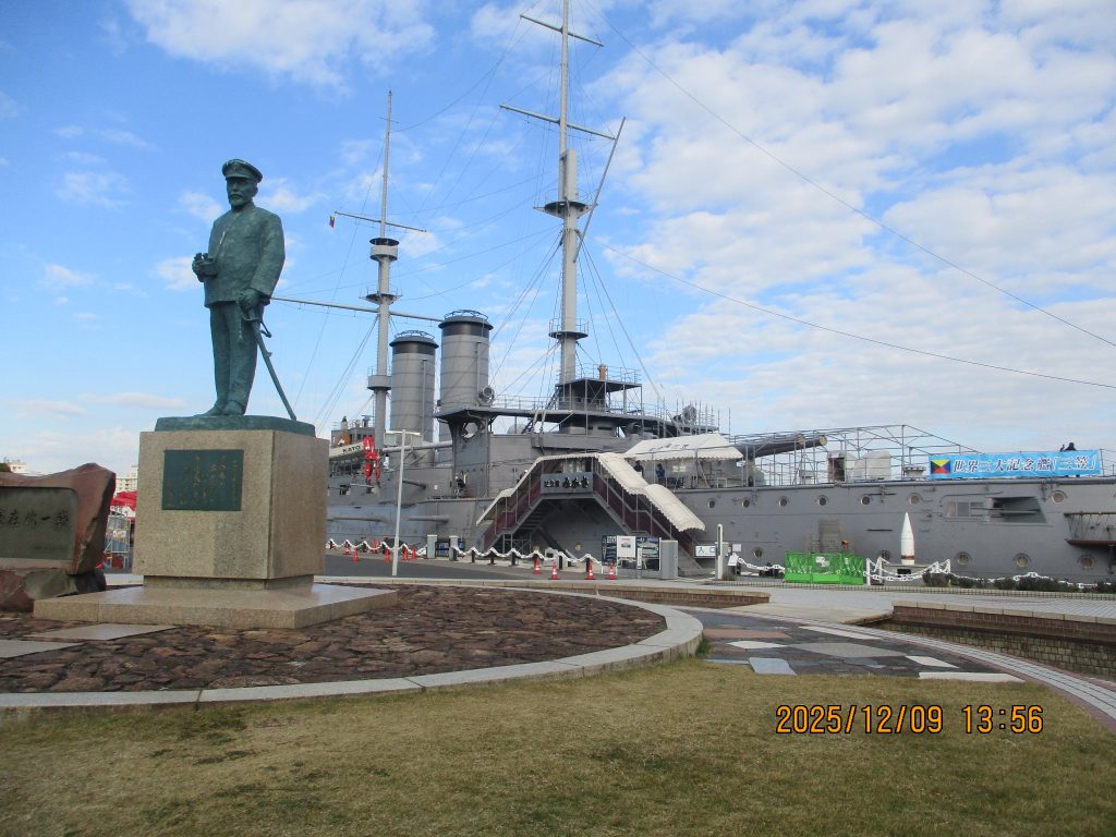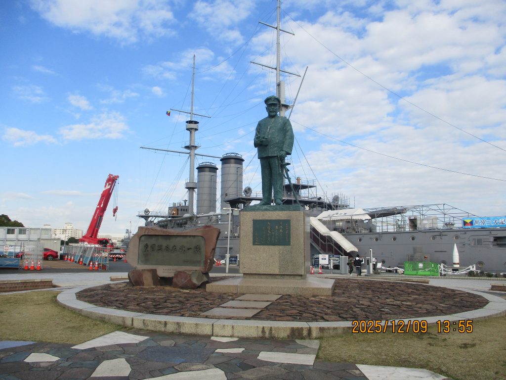面白い姿の狛犬にさよならをして次に進みます。バスで横須賀中央まで乗り三笠公園まで歩きました。14時前に記念館三笠が見えてきました。日露戦争では連合艦隊旗艦として司令長官の東郷平八郎らが座乗し日本海海戦に勝利しました。関東大震災の時に浸水し横須賀港で記念艦として保存されました。三笠の前には東郷平八郎像が建てられていて皆で記念撮影をしました。そして講師から日本海海戦の話を聞きました。