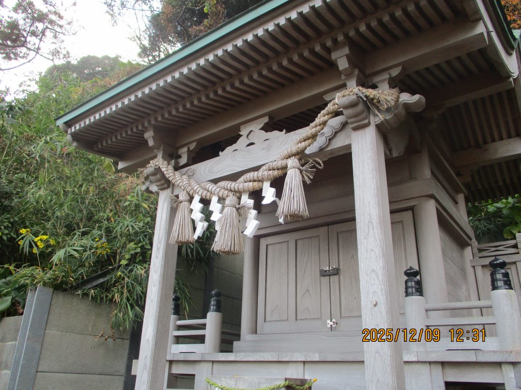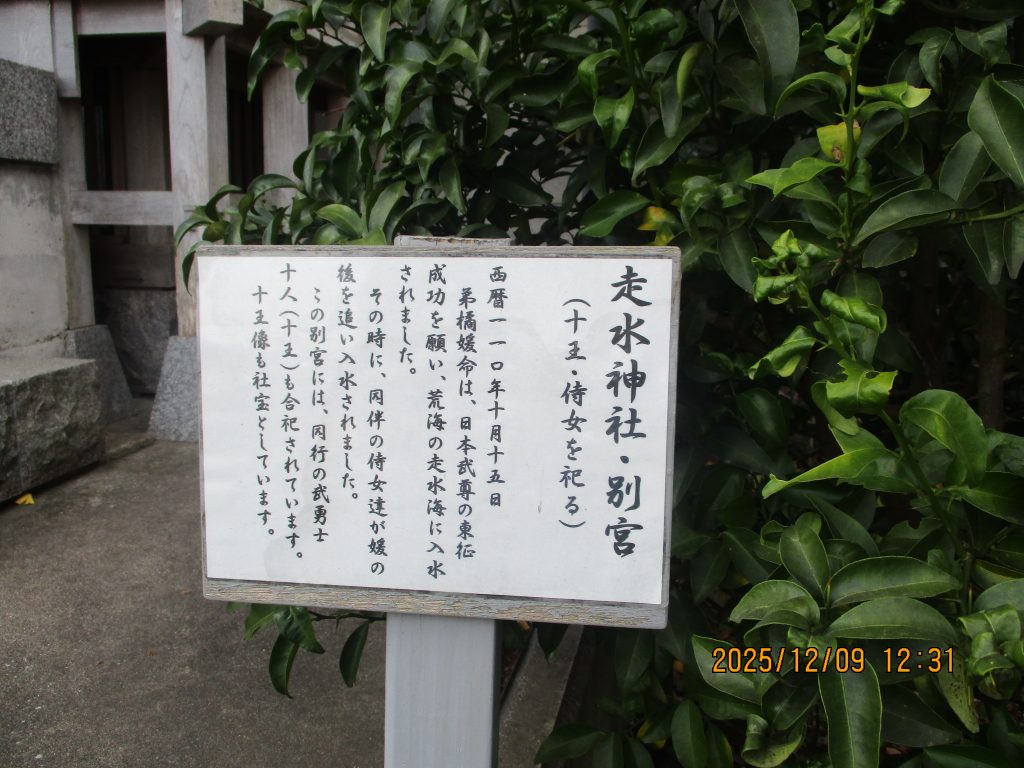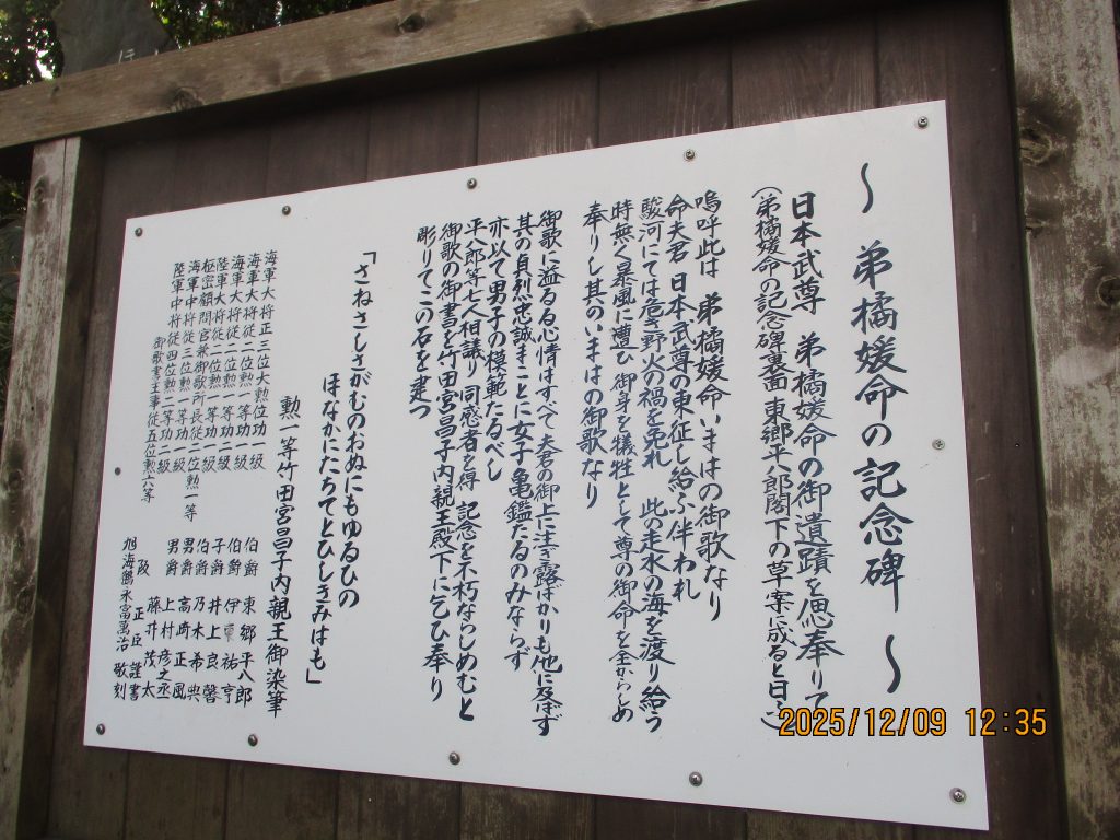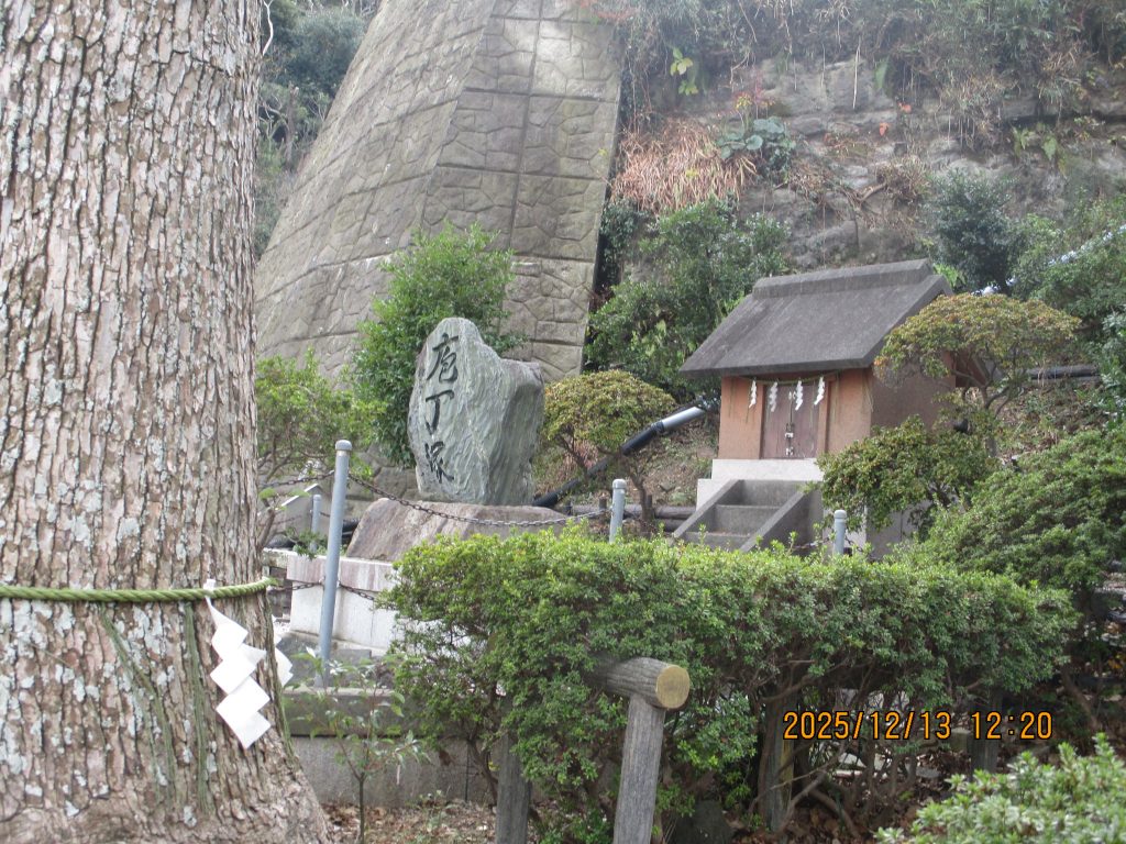 舵の碑が右手にあり日本武尊伝説で妻の弟橘媛が入水すると海が凪ぎ船が走る様に進んだのが走水の由来との事です。他説には湧水が走るがごとく湧き出る事からとも。もう一段、階段を上がると本殿がありました。別宮には弟橘媛に殉じた侍女たちは祀られていました。古稲荷碑があり前の道が古東海道との説があります。天気が良く海に向こうには房総半島の街やコンビナートが見えました。