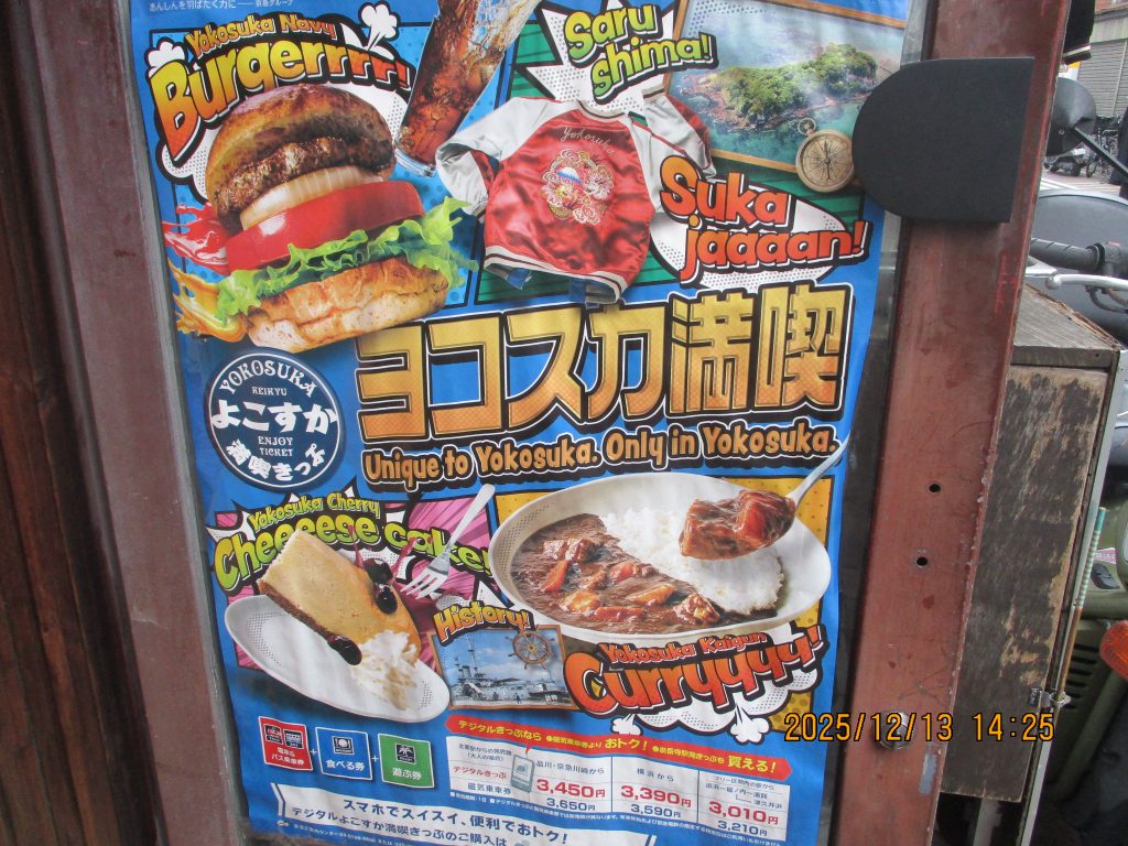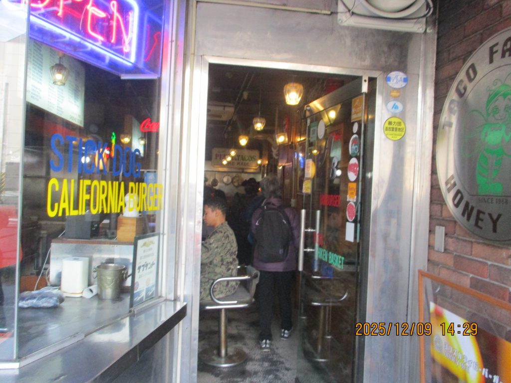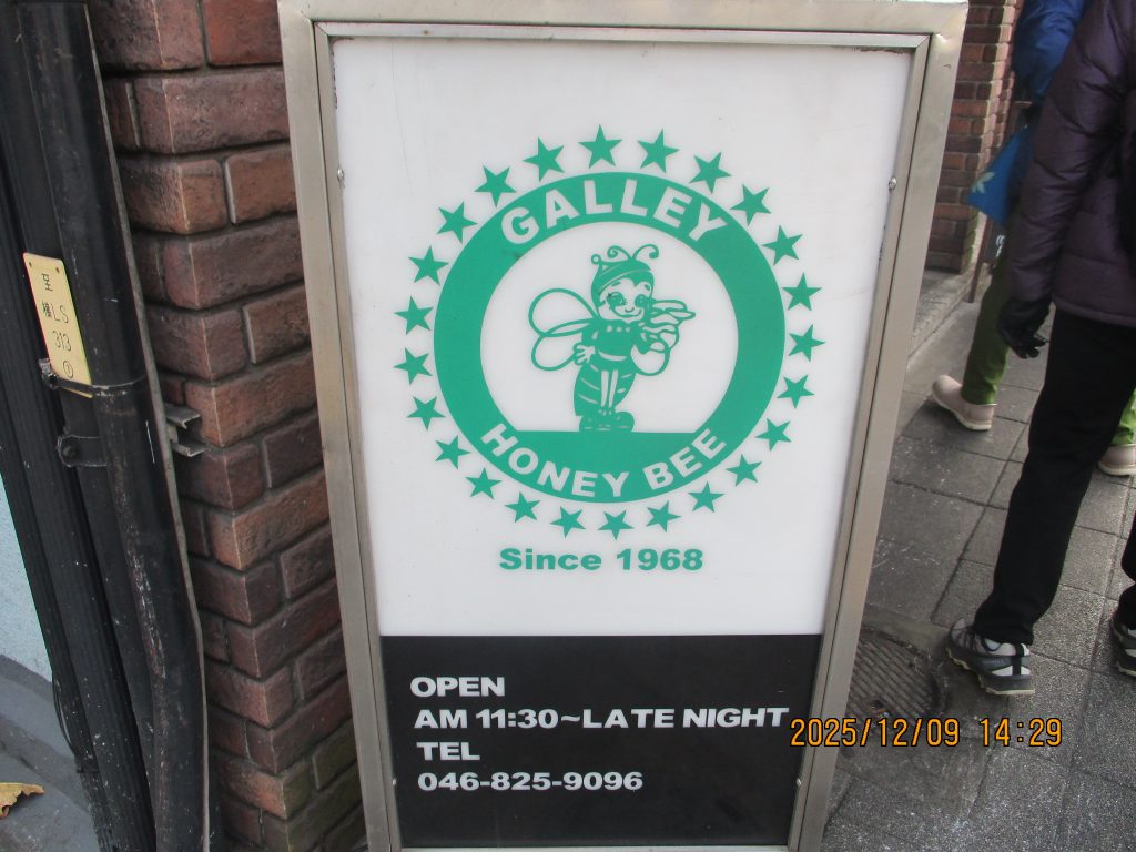 15分位歩き全長300メートルの商店街の「どぶ板通り」に着きました。戦前には道の真ん中に「どぶ川」が流れていて邪魔になるので厚い鉄板で蓋をした事から「どぶ板通り」と呼ばれるようになりました。進んでいるとアメリカ水兵の姿も見えました。アメリカ軍横須賀基地入口前に有名なHONY・BEEがありました。ミツバチのマークの店に入って昼食を取った人たちが多かったようですが土曜日は混んでいて色々なお店に散らばり食事と買い物をしました。